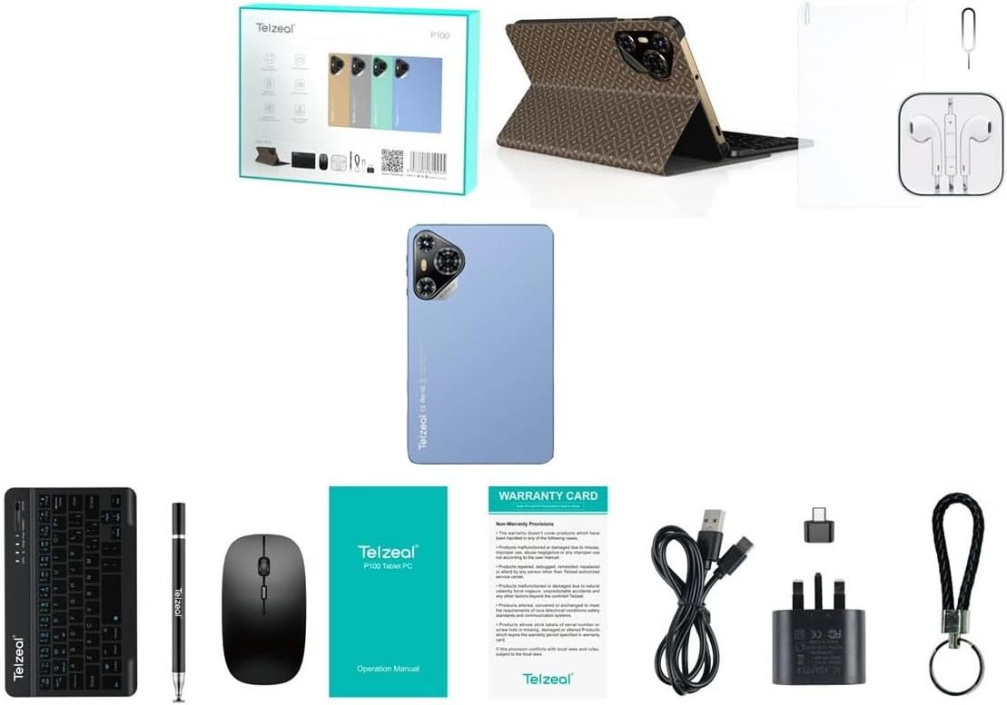 Telzeal P100 10.1 Inch Android 13 Tablet with 5G WiFi and Dual SIM 8GB RAM 512GB ROM 8000 mAh High-Capacity Battery Wireless Keyboard and Mouse.