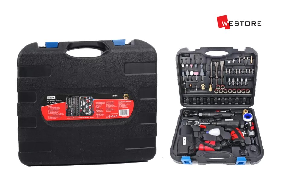 VERKK AIR IMPACT WRENCH 71 PCS KIT IS A VERSATILE AIR TOOL SET DESIGNED FOR VARIOUS APPLICATIONS THIS KIT OFFERS A COMPREHENSIVE SET OF PNEUMATIC TOOLS AND ACCESSORIES FOR VARIOUS TASKS.